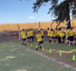 • Exercícios de agilidade e condicionamento: Corridas entre cones e treinos de força no gramado para aprimoramento físico e motor.